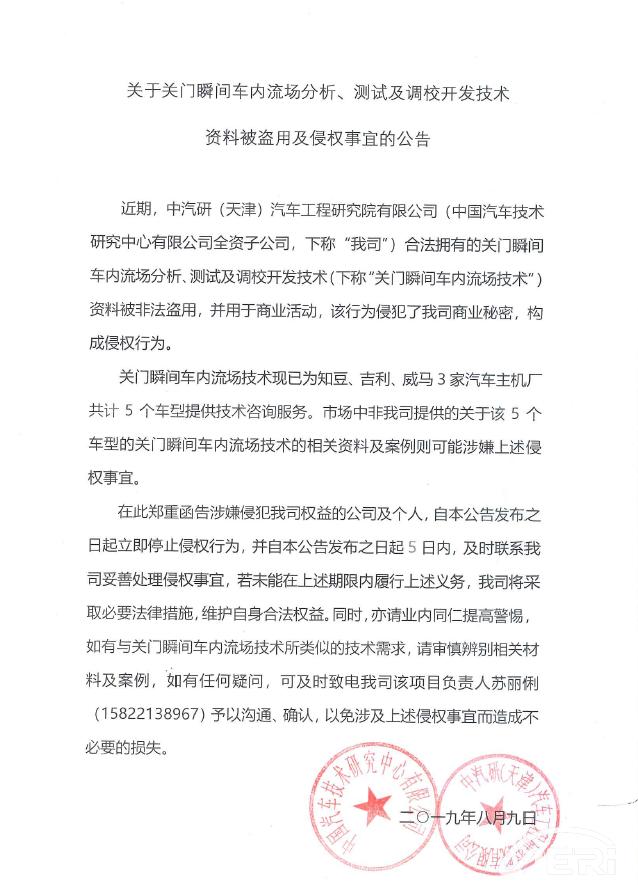 關(guān)于關(guān)門(mén)瞬間車(chē)內流場(chǎng)分析、測試及調校開(kāi)發(fā)技術(shù)資料被盜用及侵權事宜的公告