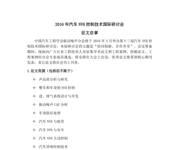 2016年汽車(chē)NVH控制技術(shù)國際研討會(huì )征文啟事