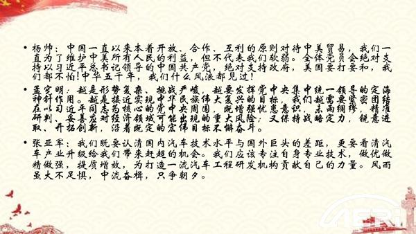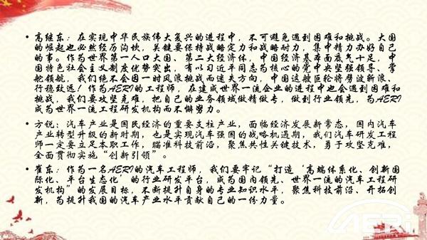 支部黨員結合自己的工作實(shí)際,圍繞國家命運、黨員責任、職業(yè)追求分享學(xué)習感想。高繼東同志表示,在實(shí)現中華民族偉大復興的進(jìn)程中,不可避免遇到困難和挑戰。在以習近平同志為核心的黨中央堅強領(lǐng)導、掌舵領(lǐng)航,我們絕不會(huì )因一時(shí)風(fēng)浪挑戰而迷失方向,中國這艘巨輪將劈波斬浪、行穩致遠!作為工程院的工程師,在建成世界一流企業(yè)的進(jìn)程中也會(huì )遇到困難和挑戰,我們要攻堅克難,把自己的業(yè)務(wù)領(lǐng)域做精做專(zhuān),做到行業(yè)領(lǐng)先,為工程院成為世界一流工程研發(fā)機構而不懈努力。支部書(shū)記方銳指出,汽車(chē)產(chǎn)業(yè)是國民經(jīng)濟的重要支柱產(chǎn)業(yè),面臨經(jīng)濟發(fā)展新常態(tài),國內汽車(chē)產(chǎn)業(yè)轉型升級的新時(shí)期,也是實(shí)現汽車(chē)強國的戰略機遇期,我們汽車(chē)研發(fā)工程師一定要立足本職工作,瞄準科技前沿,聚焦共性關(guān)鍵技術(shù),勇于攻堅克難,全面貫徹實(shí)施創(chuàng )新引領(lǐng)。